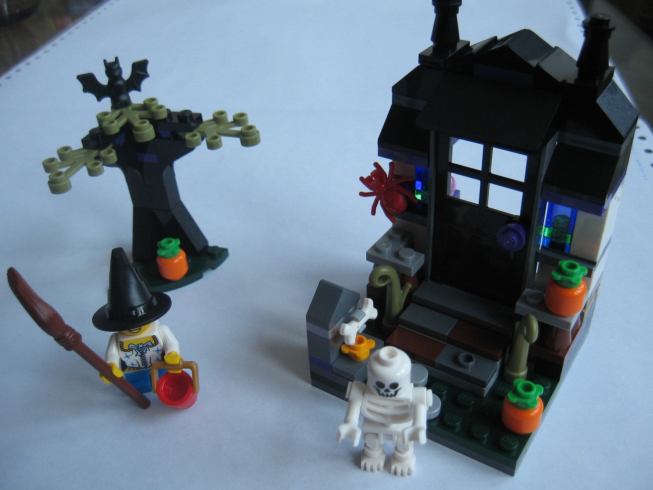2 minifgures, un enfant et un squelette, un arbre, une devanture de maison et pleins de citrouilles.