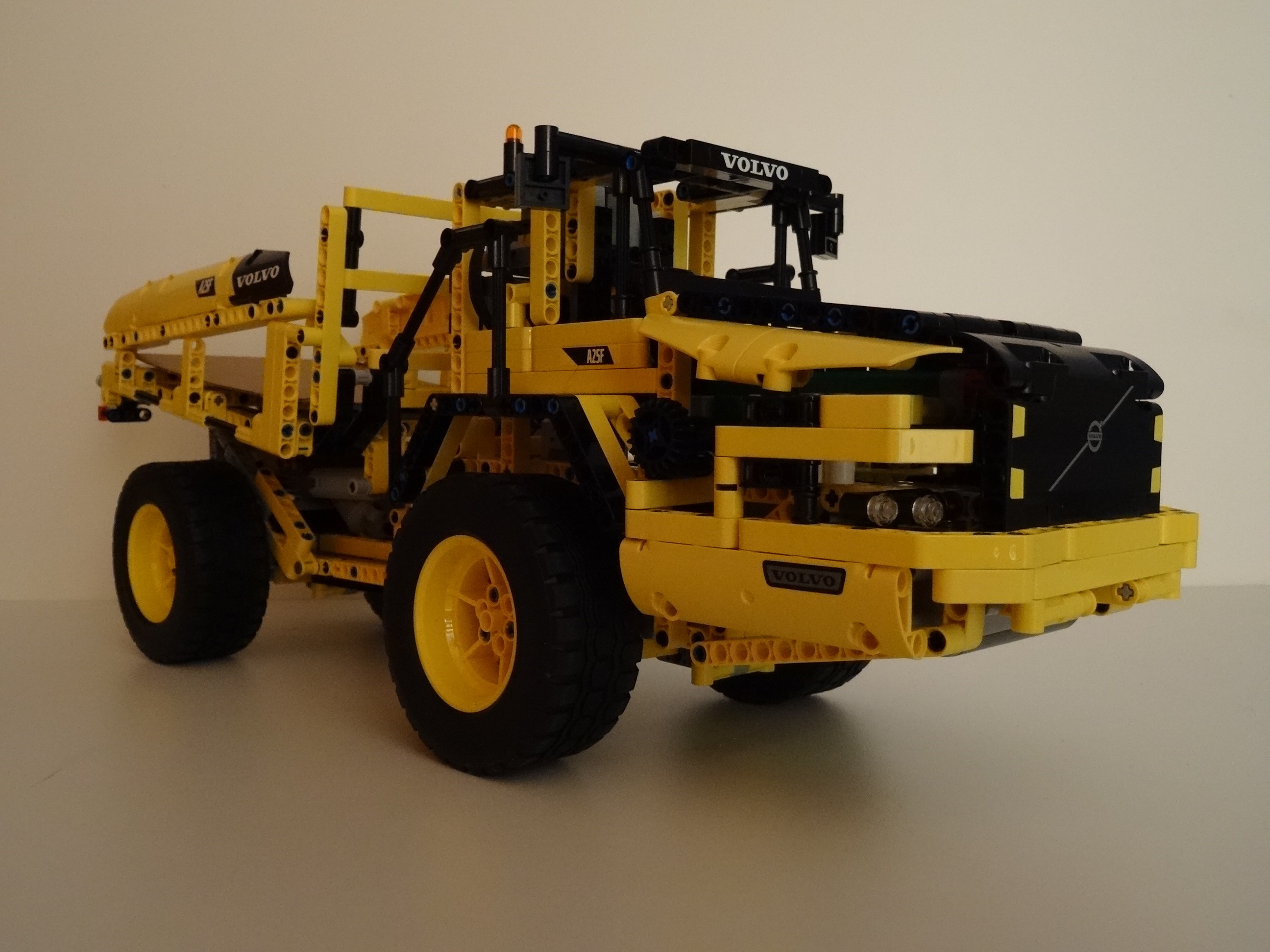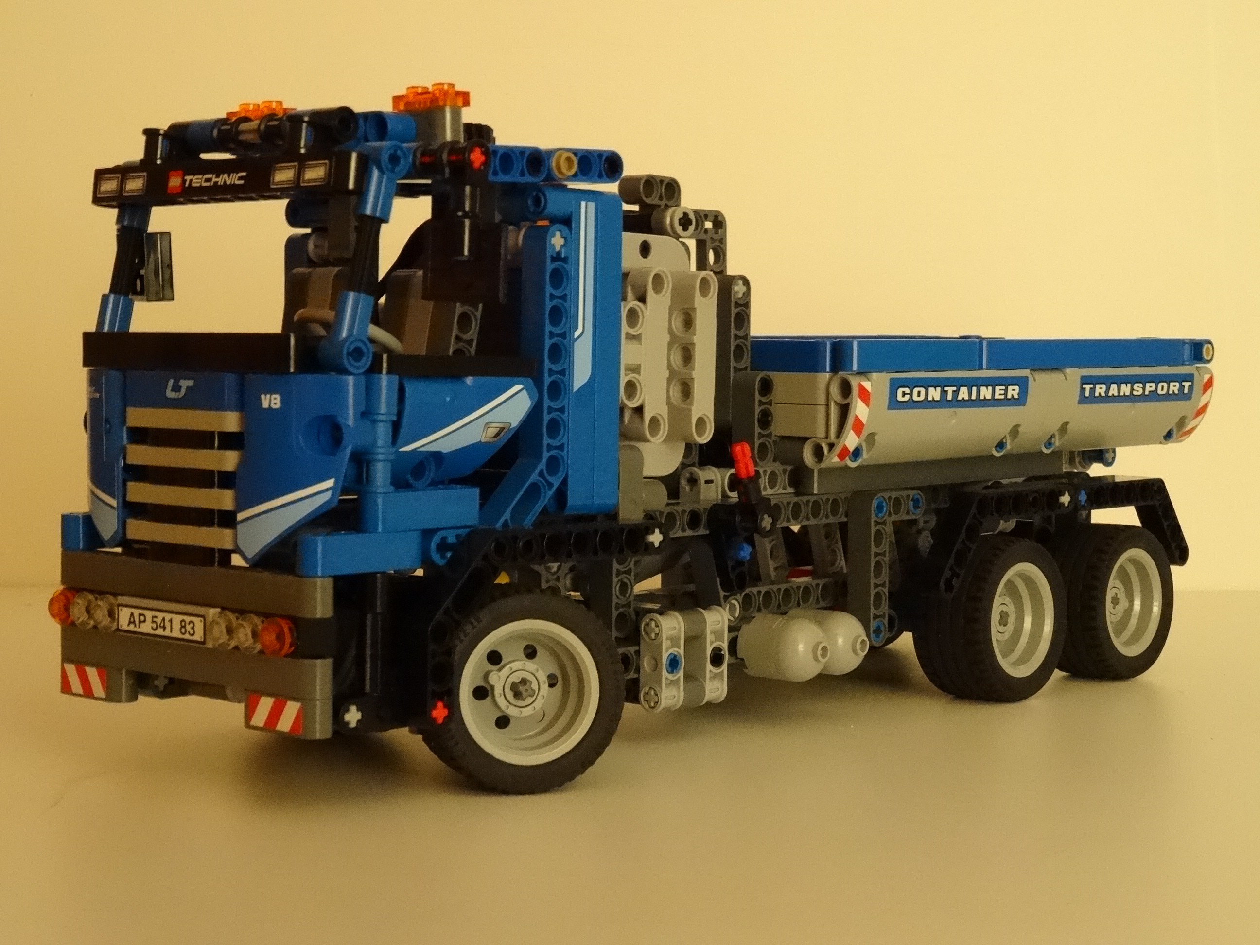 Avec une énorme grille avant, des rétroviseurs latéraux, des stabilisateurs, le camion conteneur est un robuste véhicule à six roues parfait pour les tâches difficiles. Utilises ses puissants vérins linéaires pour le déposer sur le sol.