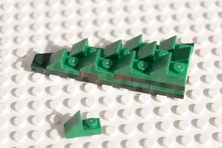 Les épines et branches sont formées d'ailes vert foncé et de plaques vert clair et marron. En 2019 (maison pain d'épice) les épines étaient formées de slopes 1x1x2/3 54200, cette année ce sont des slopes 92946 sur base 1x2.