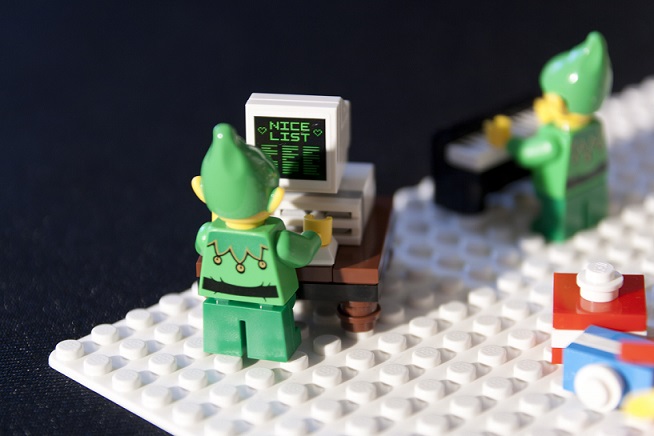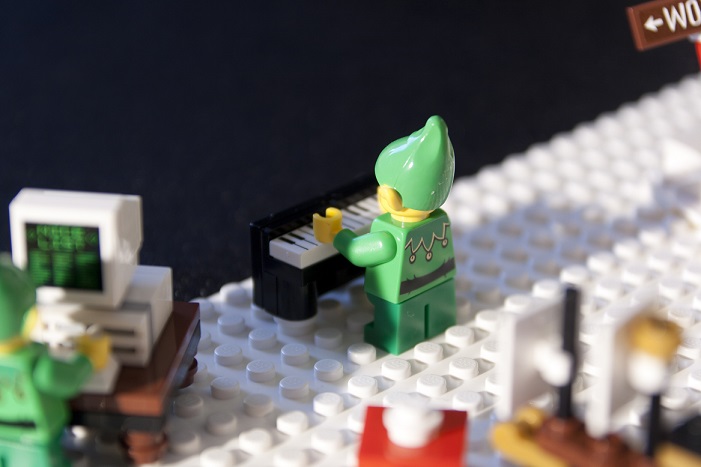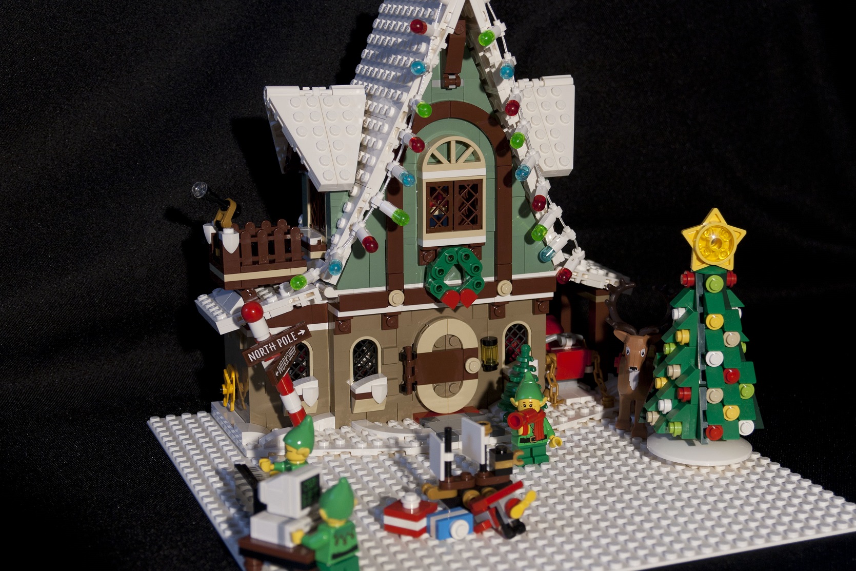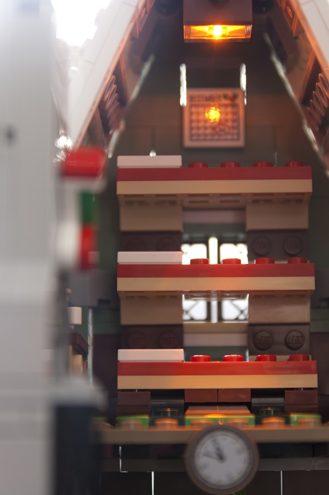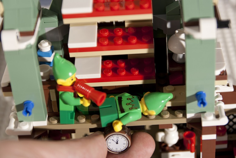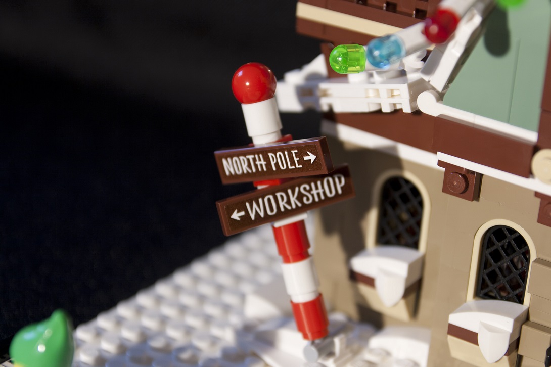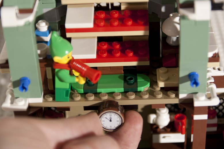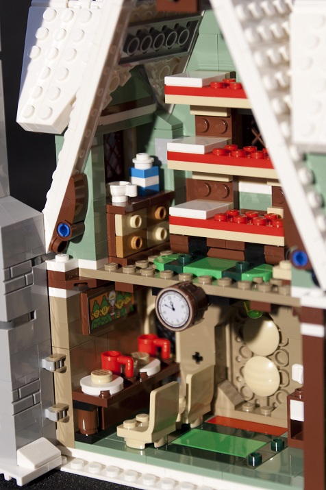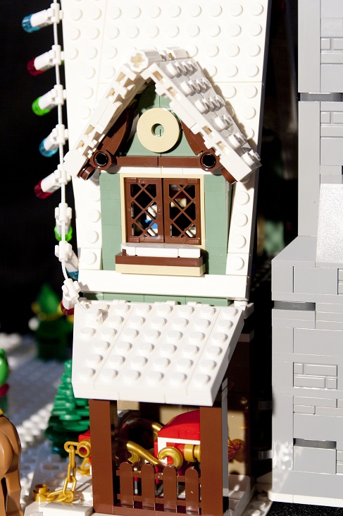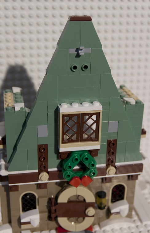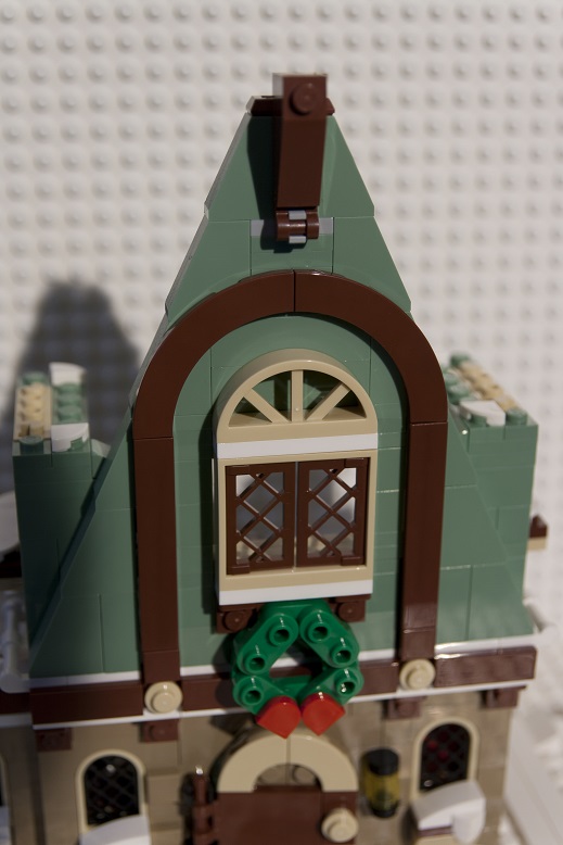 Une couronne de houx est installée en façade, elle est composée de plaques 1x2 aux bords arrondis et de deux tiles 1x1 avec un bord en ½ cercle. Ce n’est pas la plus réussie de la série mais c’est dans le ton de Noël : du vert et du rouge !