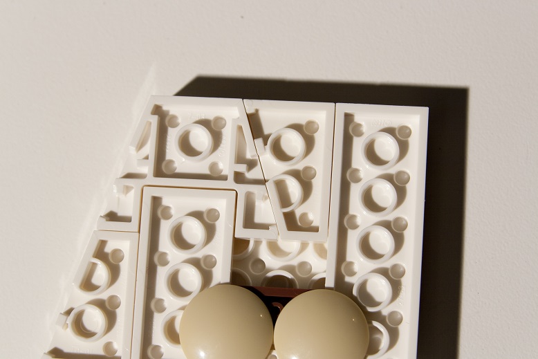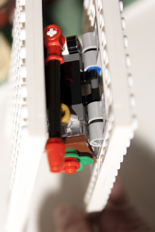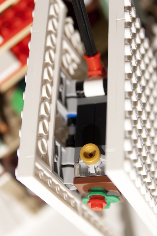 Pour relier chacun des pans un bloc est construit autour d'une brique lumineuse et de briques avec pinces 30237 qui se fixent de chaque côté sur les tiges 6L. La brique lumineuse peut être allumée via une bascule réalisée par un axe 6L monté sur une charnière et qui vient appuyer sur le bouton poussoir de la brique.