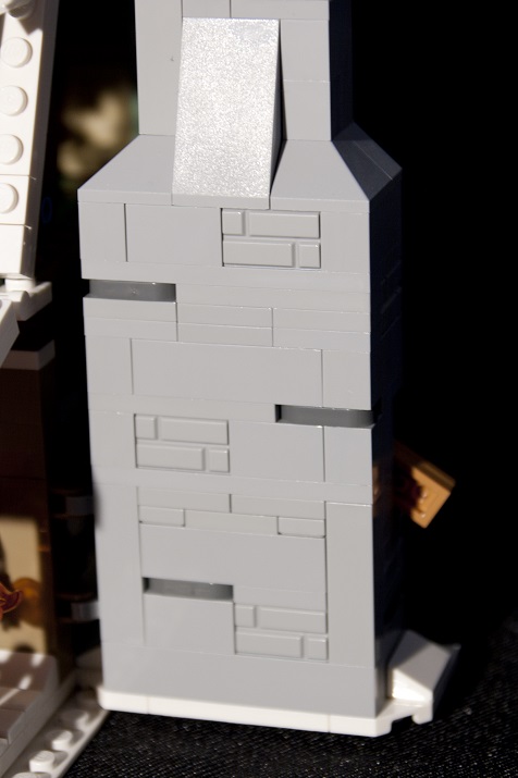 La cheminée dispose de sa propre plaque support, donc pourrait être désolidarisée du pavillon ; elle est fixée par deux charnières réalisées avec, côté cheminée, une brique avec deux pinces superposées 60583 et, côté pavillon, deux briques modifiées avec un axe vertical 34816.