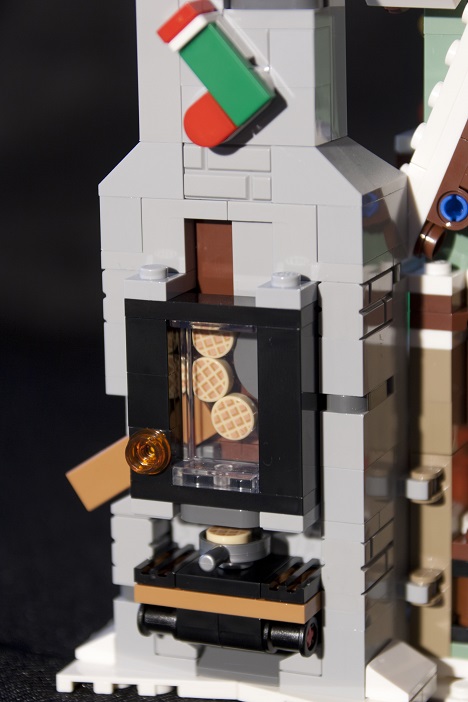 Au-dessus vient la cheminée proprement dit, toujours dans le même style. Particularité cette année, la face interne de la cheminée (celle vers l’intérieure de la maison) est munie d’un panneau vitré 87544 : l’espace disponible dans ce panneau accueille des gaufres en précuisson qui peuvent ensuite descendre dans la poêle via un petit levier (tile 1x3) qui les laisse glisser par simple gravité.