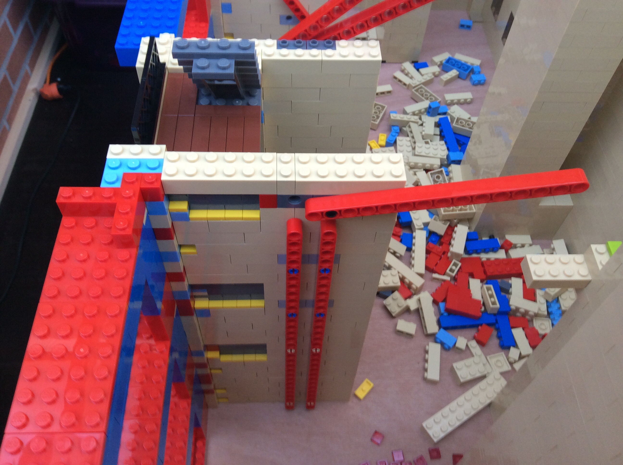 J'ai du me résigner à modifier le système de guidage des cages par le fait que vu la hauteur les murs on tendance à se courber d'où le blocages des cages avec rupture du cordage . Je dois donc démonter l'ensemble du bâtiment afin de décaler d'un demi tenon :((