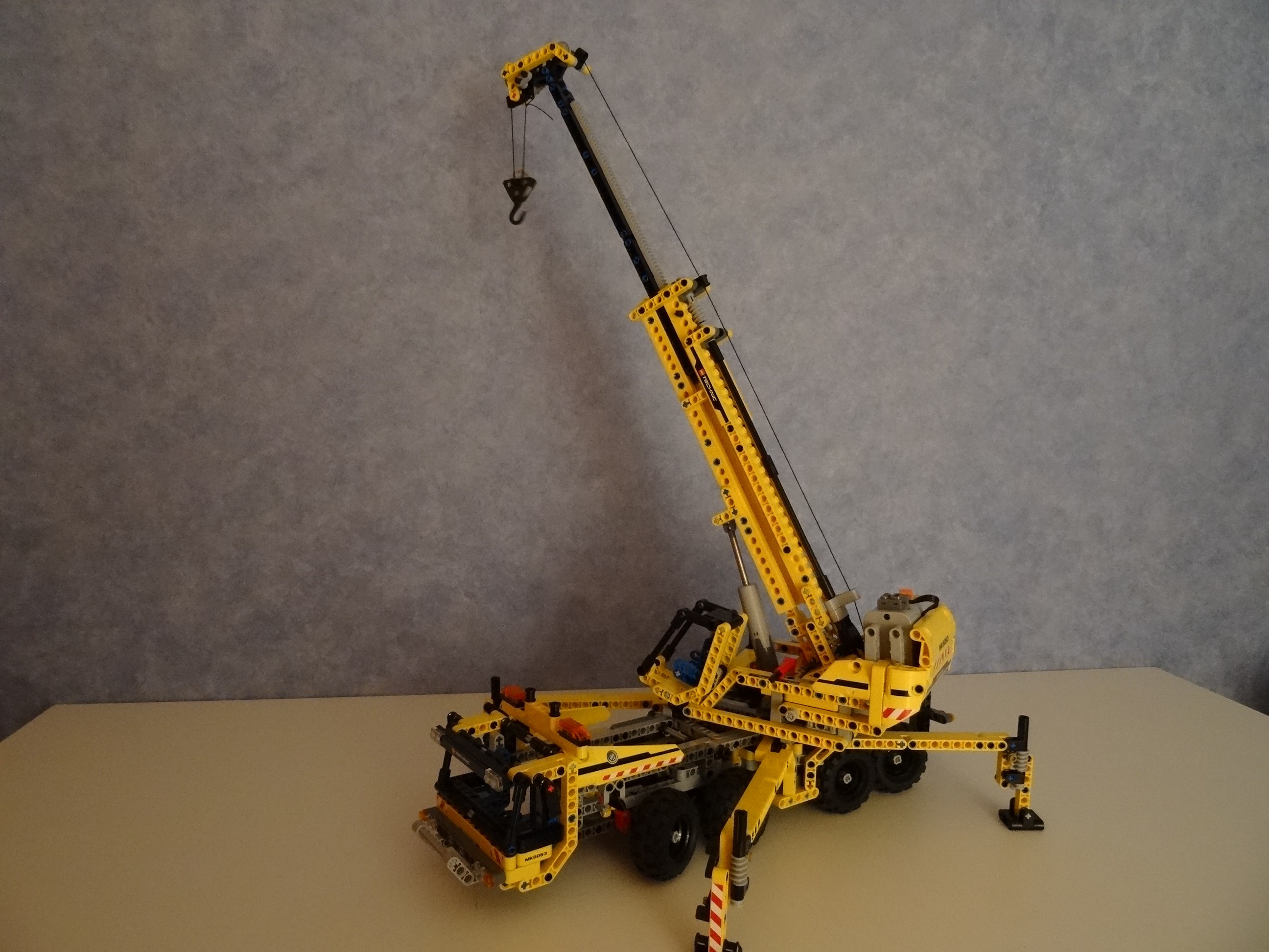 8 roues directrices et fais tourner la superstructure. Actives le moteur LEGO Power Functions pour déplier les stabilisateurs et étendre ou soulever le bras de la grue à 77 cm dans les airs. Abaisses le crochet avec le treuil qui fonctionne.