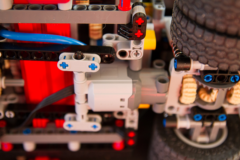 Concernant la motorisation, tout se passe sous le chassis, avec un moteur L. Je suis venu les axes qui venaient relier le moteur factice aux essieux arrière, et la place je suis venu greffer mon monteur L. J'ai remplace l'axe de 4 with stop par un axe de 3 en gardant la bevel 24T. J'ai du installer aussi une barre pour empêcher le moteur de reculer.