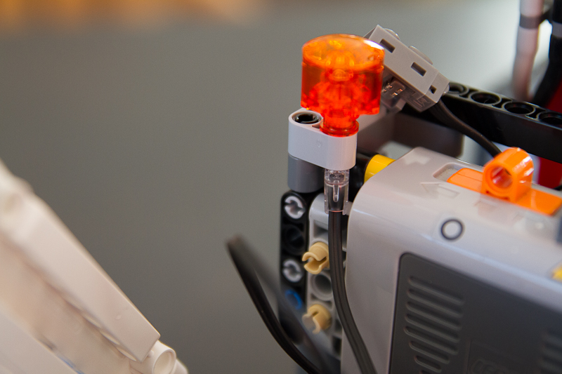 Passons à la direction. Là j'ai opté pour un servo moteur, j'ai tout simplement enlevé tout le système qui permettait aux deux gyrophares de tourner en faisant tourner le camion, le servo moteur vient se loger à cet endroit sans soucis, on remet au dessus le liftarm en L et la barre et le tour est joué. J'en ai profité pour modifier aussi le système de fixation des gyro, ils tiennent maintenant sur 2 round plates trans-orange et sous le liftarm est venu se positionner le système éclairage. Le pot d'échappement vient lui se fixer maintenant sur la cabine.