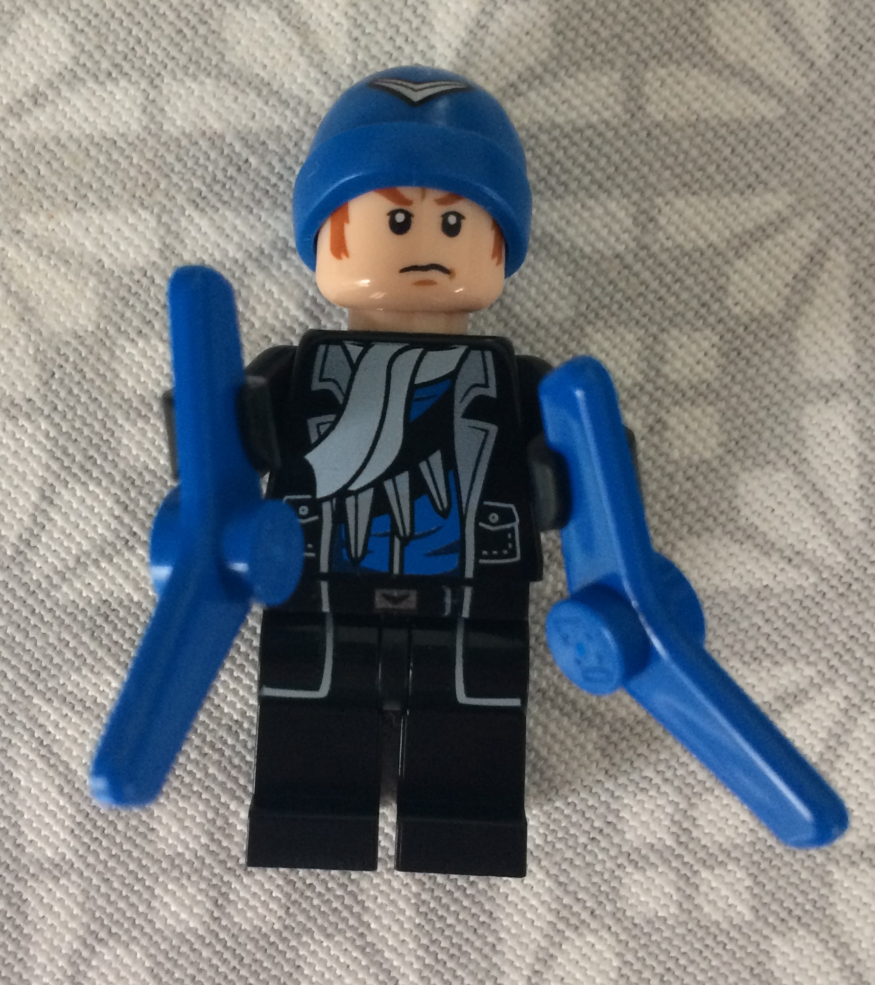 Pour les jambes, on se retrouve avec une continuité dans la veste très simpliste mais qui donne un bel effet visuel sur la longueur de celle-ci et un petit logo en forme de boomerang au niveau de la ceinture. Vous ajoutez à cela un bonnet sérigraphié d'un boomerang , une couleur rousse pour les cheveux et on a vraiment une superbe figurine, de loin la meilleure de ce set. Les concepteurs ont pris soin de créer deux gros boomerangs pour notre méchant.