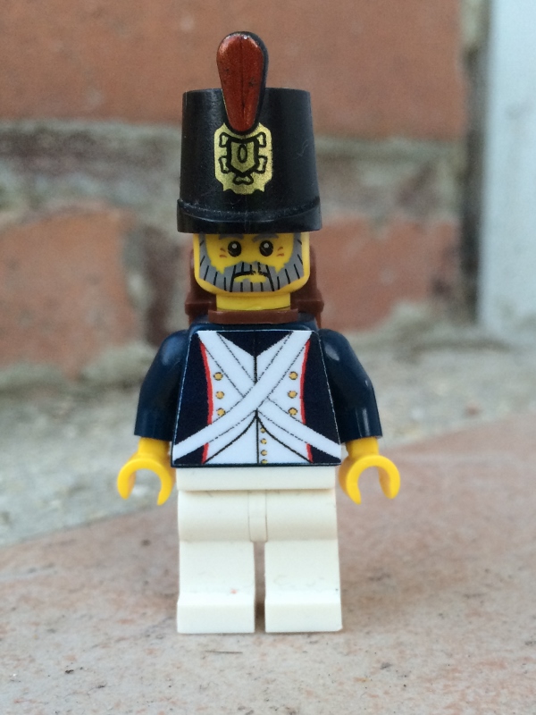 Chapeau de Barbossa (Pirates des caraibes), tête et mains bandit de Lego City, torse Anakin starwars, épée escrime minifigs serie 13 et jambes cheval et porte épée classique Lego