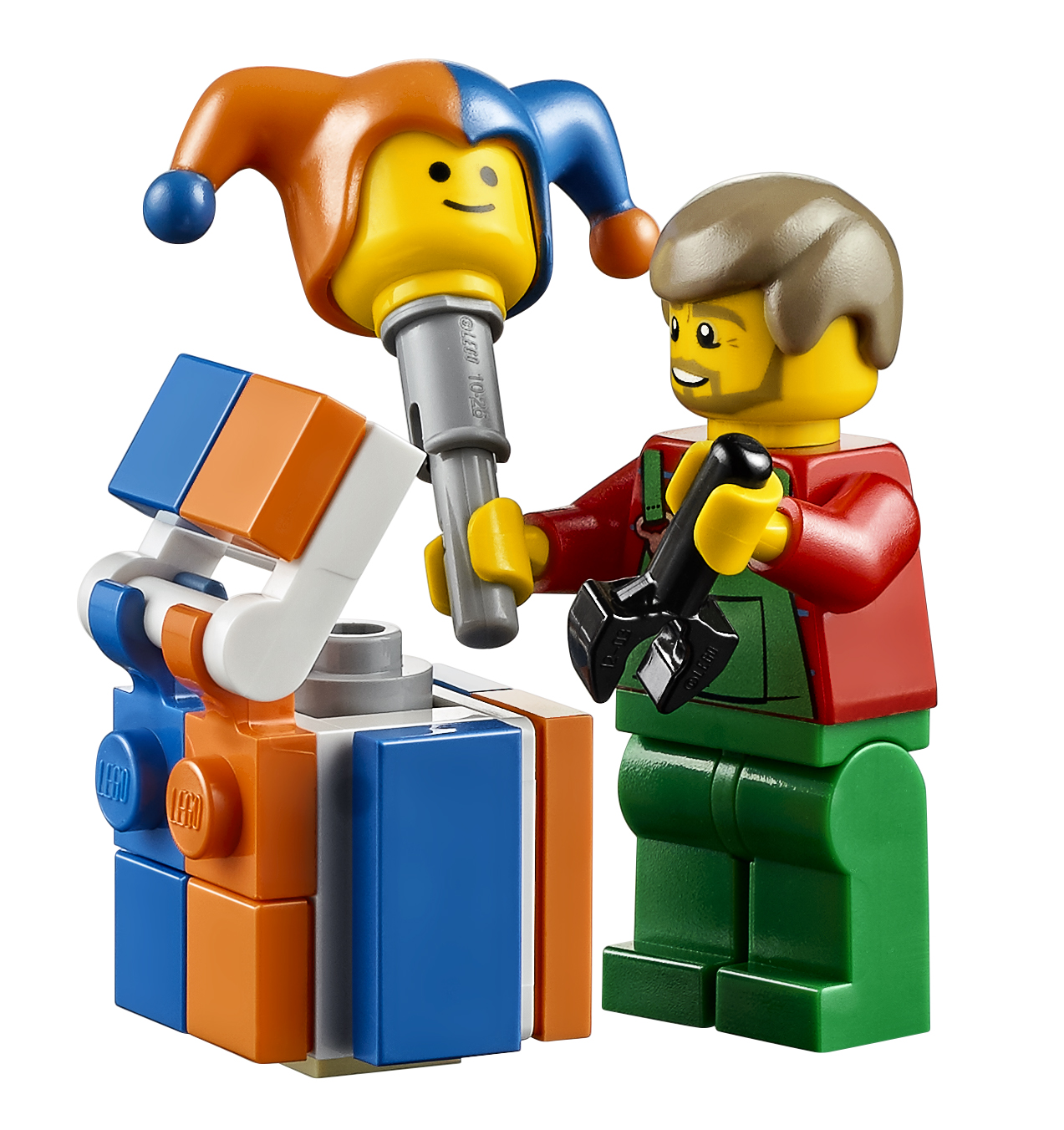 Ce charmant set dispose également d’une échelle, d’arbres de différentes tailles, jack-in-the-box, un hélicoptère, une fusée, un train, une voiture de course, un camion, un Robot, un remorqueur, un ours en peluche et un cadeau emballé.