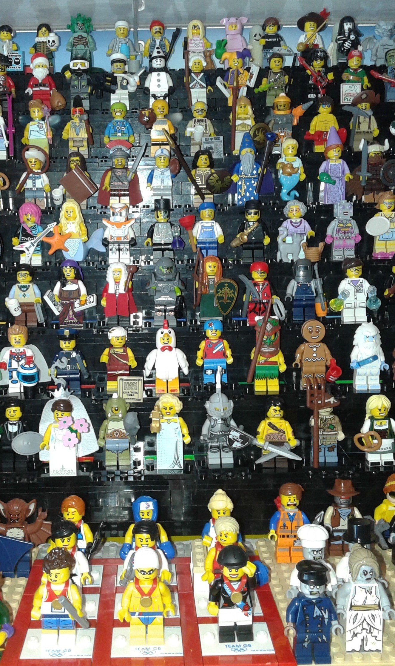 C'est donc fait ! J'ai récupéré une grande vitrine Lego city et je suis venu y loger un grand gradin de 8 marches. En surfaces c'est l'équivalent de 3 grandes plaques grises. Le dessus des marches est réalisé avec les supports des minifigurines et de quelques tiles (d'ailleurs il m'en reste quelques une à ajouter....). J'ai utilisé pas mal de duplo pour réaliser la structure du gradin et je suis venu l'habiller de briques noires... Elle peut accueillir 288 minifig, certes un peu serrées mais au moins toutes au même endroit ! Pour le moment j'y ai mis toutes les minifigurines provenant des séries de 1 à 15, il me reste un peu de place pour les suivantes... Devant le gradin, et pour le moment... de simples plaques de 16 par 32 pour accueillir le reste de mes figurines...