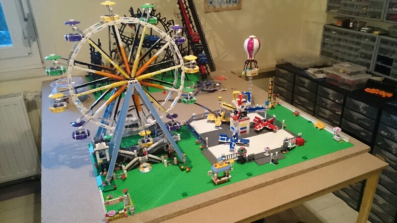J'ai pas retouché la grande roue, seul le système de motorisation pour éviter que le moteur tourne à plein régime. Pour le mixer j'ai retiré la remorque pour le transformer en manège fixe. Plus tard je rajouterai un quatrième bras avec la couleur vert.