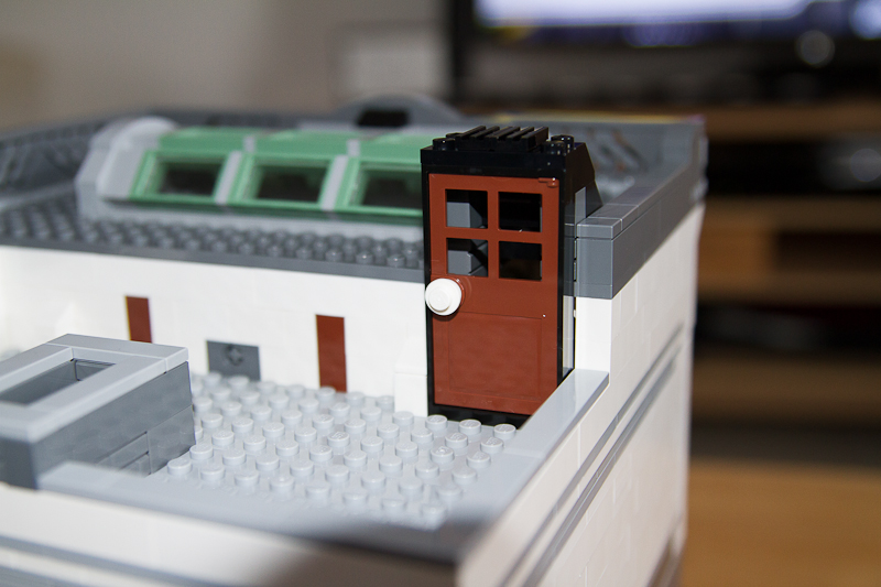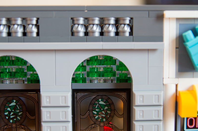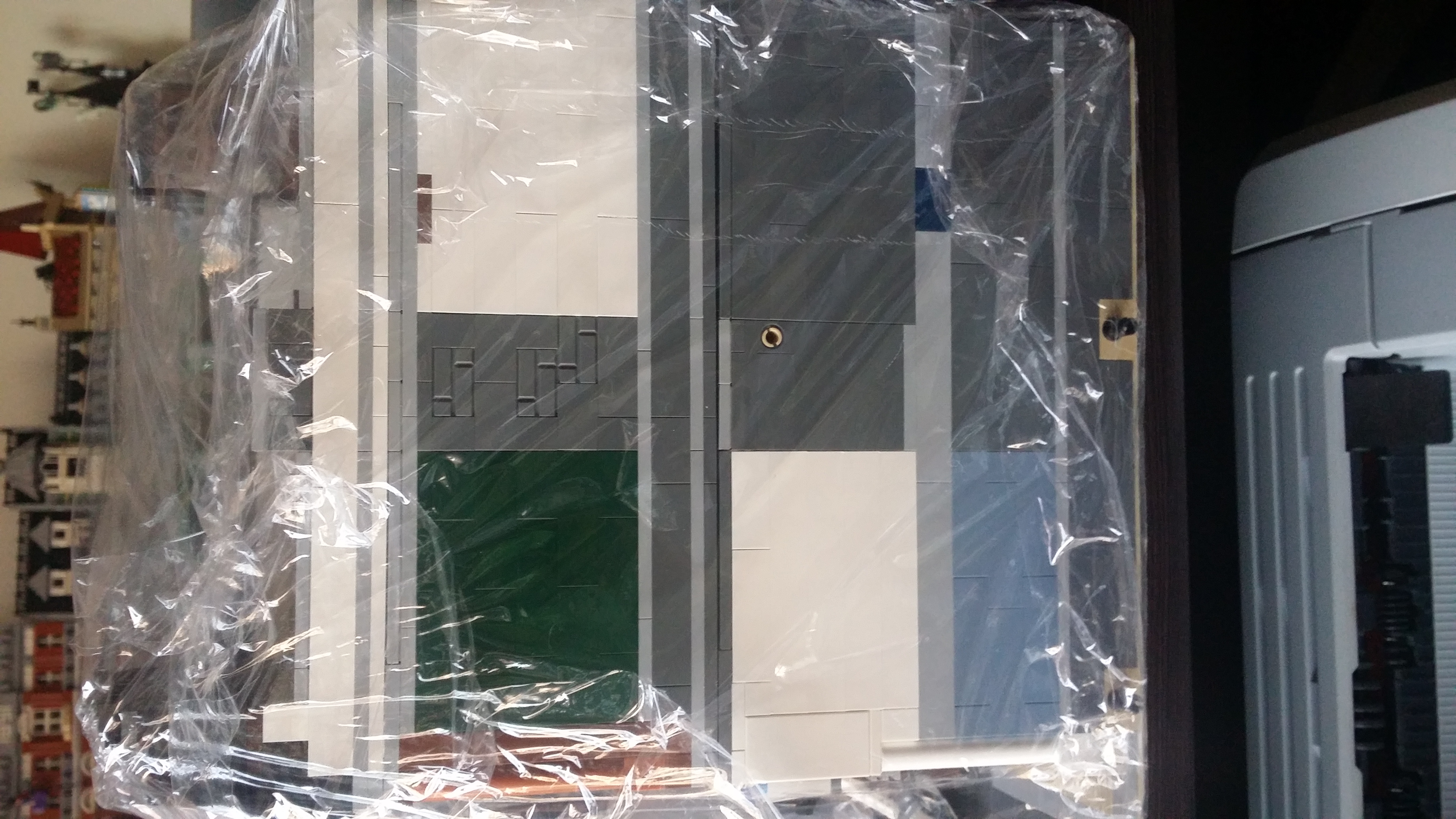 On terminera donc ici le montage, 4 sachets nous attendent. Si on regarde bien il nous reste quelques éléments extérieurs, et surtout le toit ! Le montage du toit commence biensûr par le "plancher" on devine rapidement que l'on va laisser une ouverture... pourquoi faire? Laisser rentrer la pluie pour mouiller les billets et voir si ils se multiplient? on peut rêver ! non tout simplement pour monter une magnifique verrière avec les mêmes vitres que la facade en sand green, ca habille vraiment le batiment et lui donne du cachet, de plus sous cette verrière on viendra positionner un magnifique lustre (de quoi s'amuser avec des Leds..) une porte donnant sur l'escalier permettra aux protagonistes et autres employés de banque de venir déjeuner sur le toit ! Sur les extérieurs, on habillera le trottoir d'un magnifique banc en bois avec accoudoirs, d'un lampadaire et d'un poteau coiffé d'une plante grimpante. Concernant les minifigs, je suis un peu sur ma faim... les deux banquiers sont très bien réussi, les sérigraphies sur les torses sont superbes, le laveur de vitre ou gérant de la laverie au choix, est plutôt pas mal avec un petit coté babacool. Par contre, la demoiselle (qui est aussi celle qui reçoit le chèque) est un peu décevante, d'autant qu'on lui retire sa perruque pour lui mettre le bonnet et un foulard pour en faire le cambrioleur... euh, un cambrioleur habillé en rosé avec pantalon vert fluo, ils ont vu ca souvent chez lego? et la petite gamine, ben je sais pas trop ce qu'elle fait là... autant supprimer cette figs et nous mettre un vrai voleur en black suit... Pour conclure, ce set est tout de même une très belle réussite, on pourrait croire que deux étages ca sera un peu juste, surtout quand on compare au restaurant parisien, mais non, pas du tout, mis cote à cote ces deux batiments vont bien ensemble. Quelques petites modifications à venir bien sûr, éclairage et deux trois détails, mais ca reste un très achat pour les fans de la gamme et pour ceux qui veulent s'y mettre. Après 6h de montage sans lassitude, on monte les étages ensemble et le bâtiment prend vie tout seul.