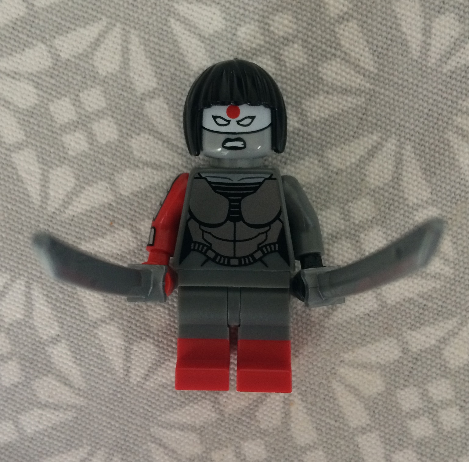 KATANA SH 283 : Un visage bicolore gris et blanc avec un point rouge sur le front. La coupe de cheveux en noir est assez typique des films japonais ou chinois de combat de samourai féminin dans le style de tigre et dragons ou encore le secret des poignards volants ( pour les cinéphiles, je vous conseille les deux films ;) ). On continue avec un torse qui fait armure en bicolore également. Deux bras différents dont un sérigraphié, c'est assez sympa et sa change des autres figs SH. En enfin pour clôturer le tout des jambes grises et rouges. Encore une belle réalisation pour cette figurine. Le jeu des deux couleurs sur quasiment toutes les pièces est franchement agréable.