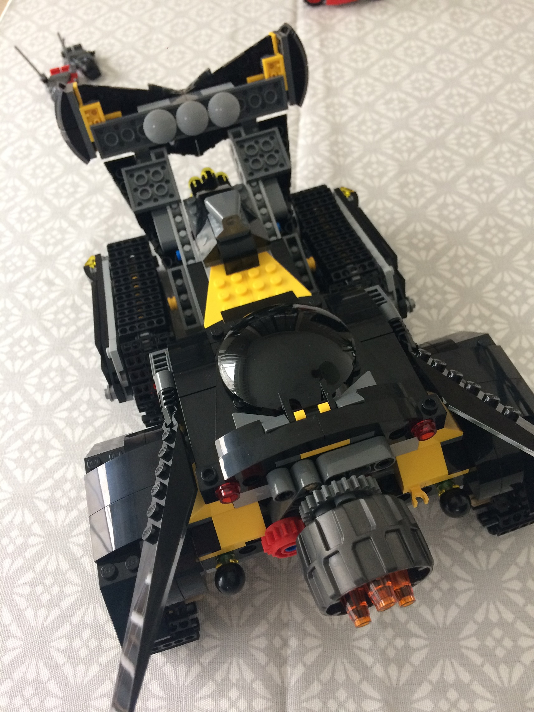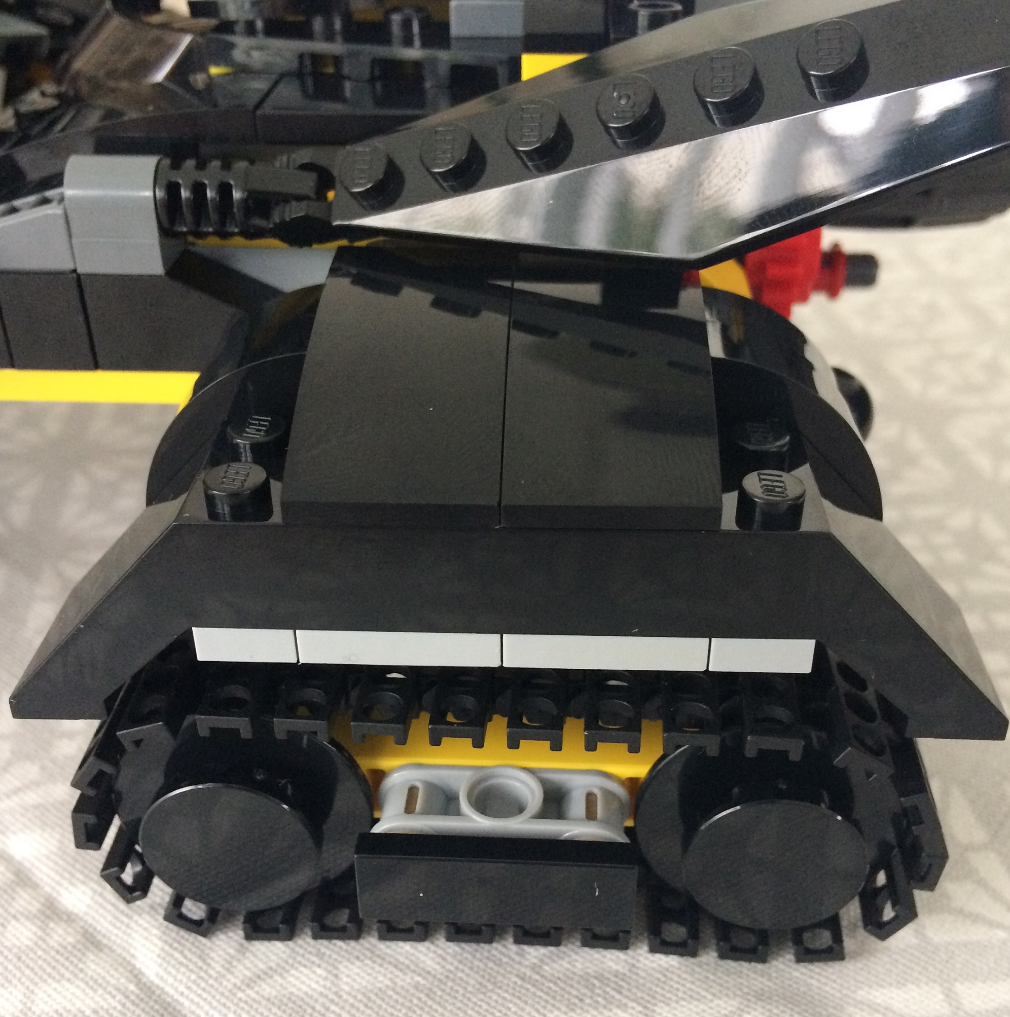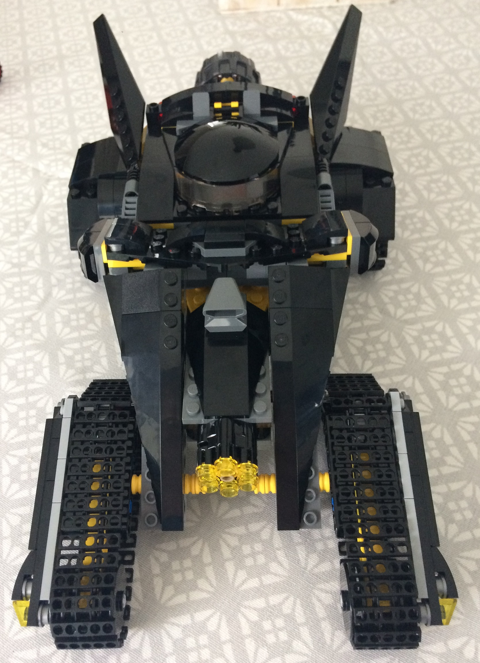 Pour le Bat Tank , s'il il y a bien une qualité, c'est le volume, il est imposant. Les chenilles et les gardes boues sont assez sympathiques dans l'ensemble. A l'arrière du véhicule, vous avez un système de poulies permettant de faire basculer le capot du bat-tank vers l'avant . Là ou le bas blesse, c'est que sa coince quand on veut remettre le capot en arrière, sa bloque au niveau du système de poulies. Pour info, j'ai redémonter avant de bien confirmer ce problème. En plus, cela n'apporte rien à la jouabilité du véhicule.