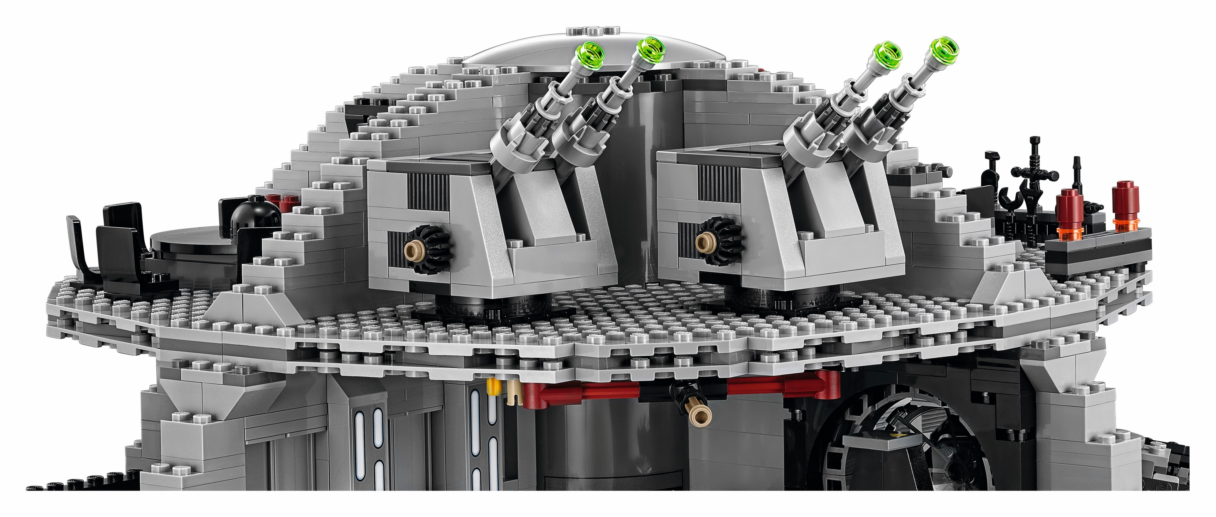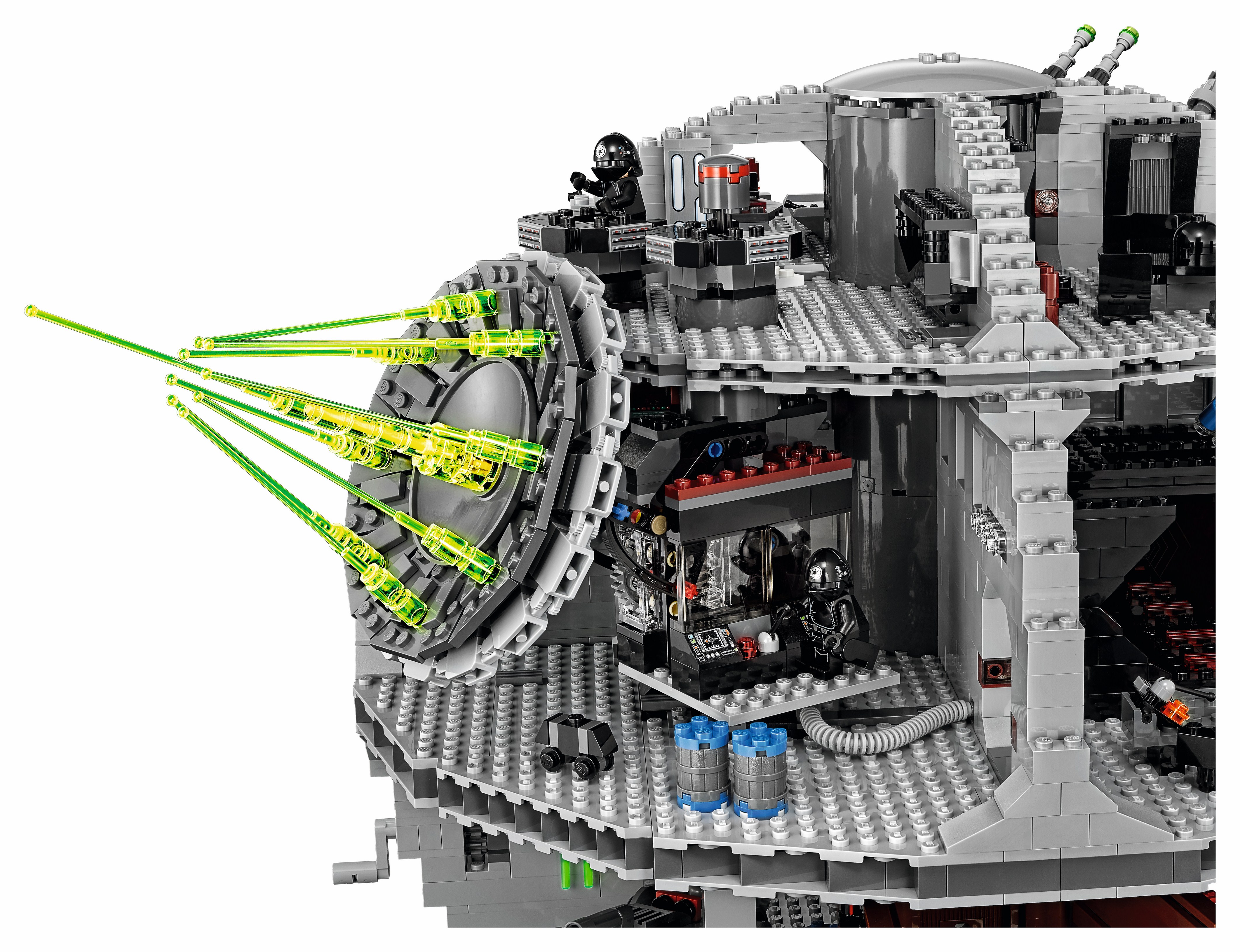 • Features a superlaser control room, Imperial conference chamber, hangar bay with moving launch rack and detachable TIE Advanced with space for Lord Vader inside, Emperor Palpatine’s throne room, Droid maintenance room, detention block, trash compactor, tractor beam, cargo area, turbo laser with spring-loaded shooters and seats for the 2 Death Star gunners, and 2 movable turbo laser towers.