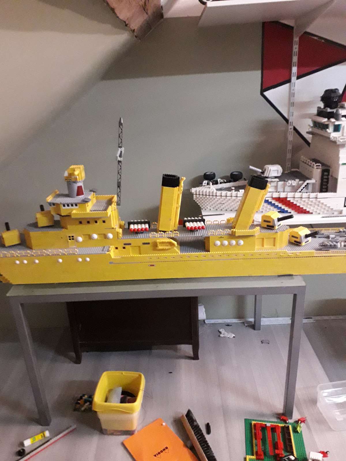 toute façon pas assez il faut a la louche 7m20/ par une brique environ 3.2 cm 2250 par etage donc pour le noir 14000 pour le rouge 78000 pieces en blanc 78000 pour le doublage de la coque 4 tenon et environ 30000 pour les renfort interieurs je commence fin octobre