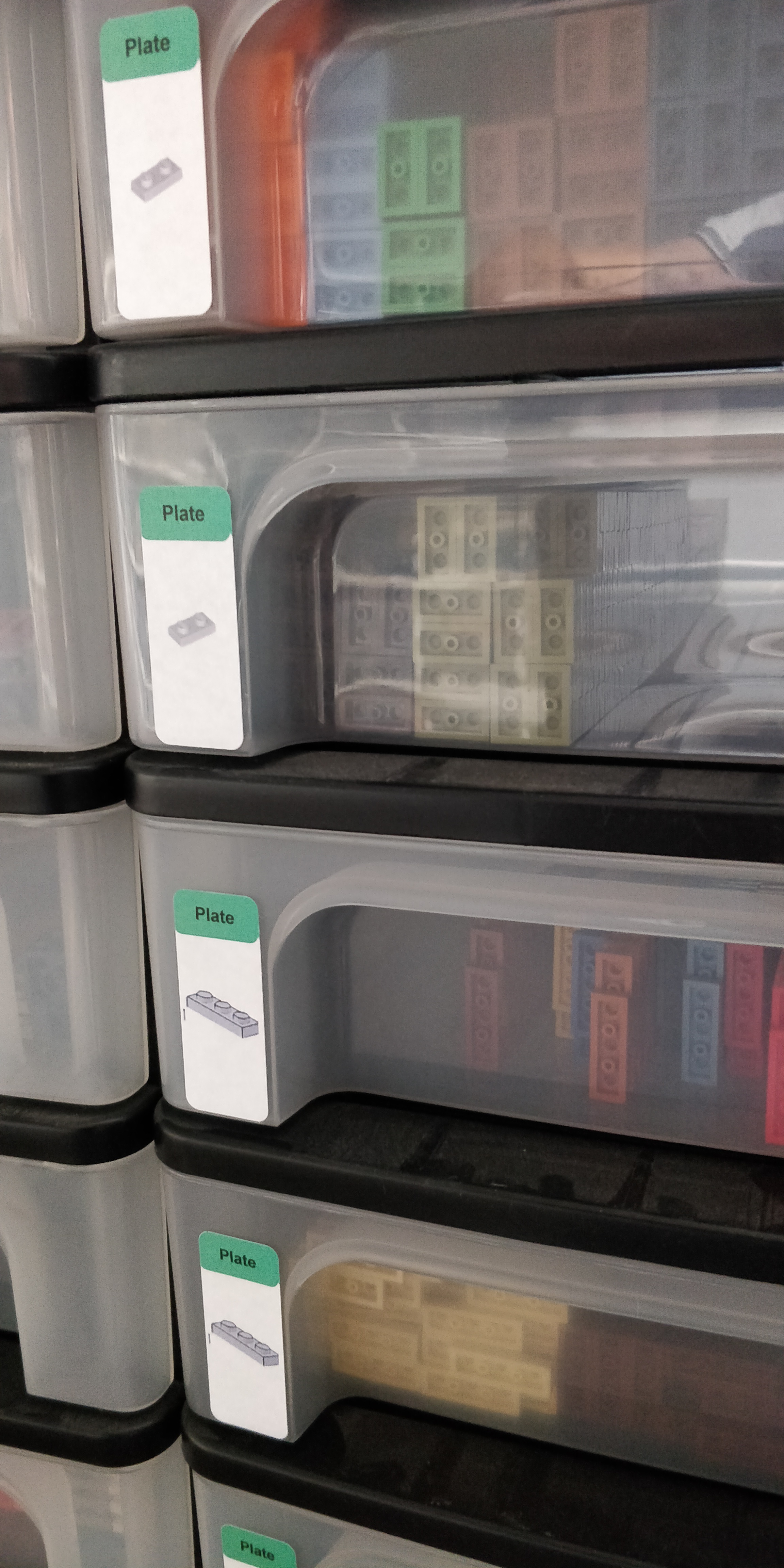 On ne voit pas toujours bien le contenu de nos tiroirs, pour faciliter le visuel, j'ai utilisé des bandes de gomme autocollantes compatibles lego (voir emballage dans les photos jointes) en découpant des carrés de 2x2, collés sur le tiroir, et sur lequel je mets une des pièces, c'est interchangeable si le contenu change.