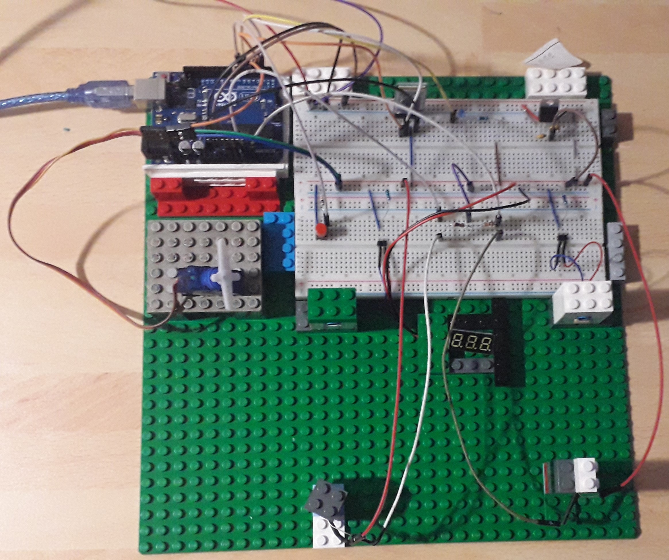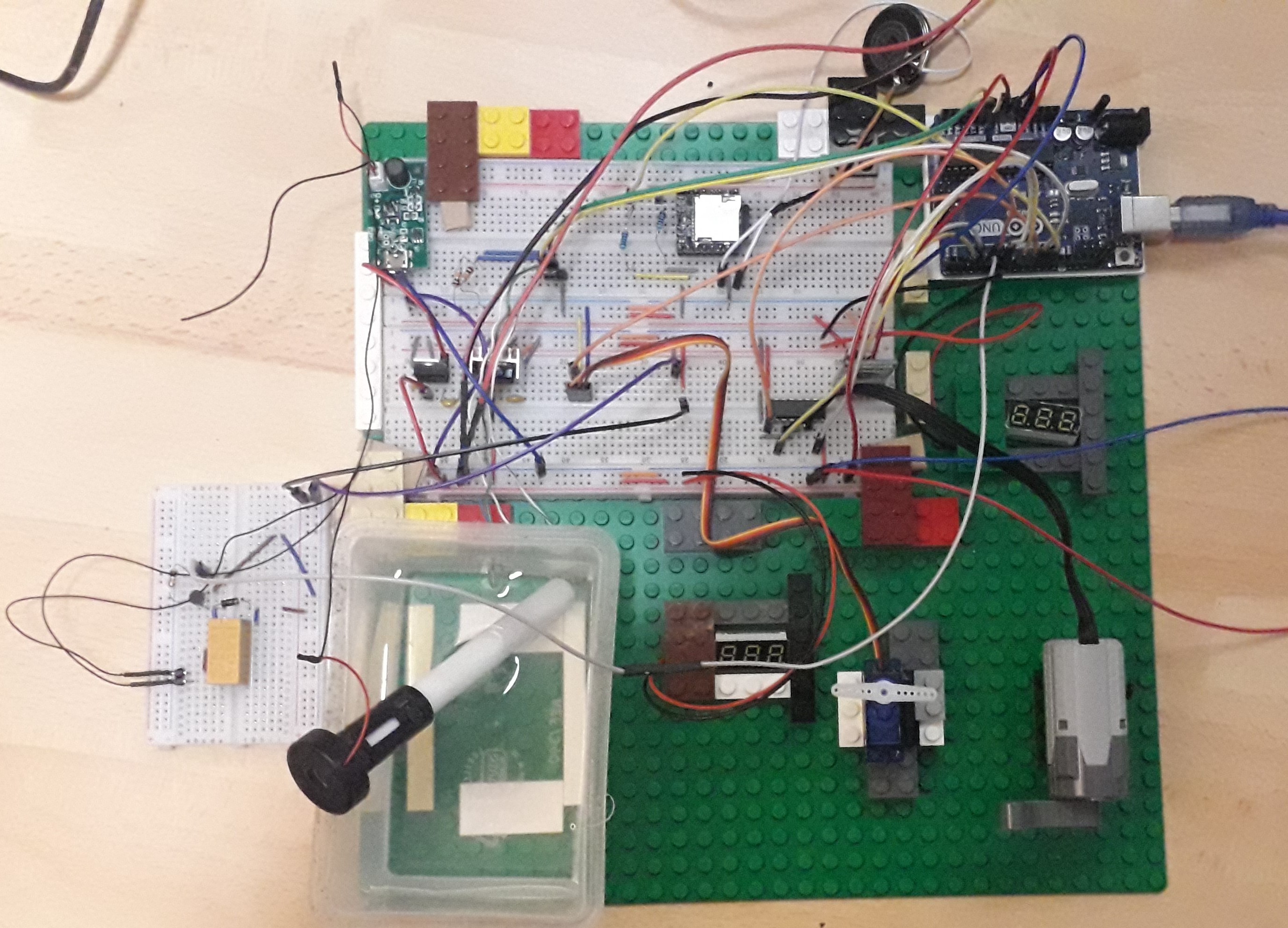 Un moteur M est utilisé provisoirement à la place du moteur du train, une Arduino Uno remplace la Nano, et une boîte fait office de réservoir, en attendant qu’il soit remplacé par un réservoir sur mesure. Prototype de la gare :