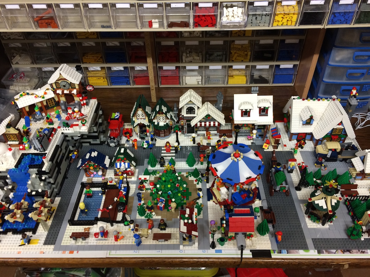 les sets présent sont:-le magasin de jouet-la boulangerie de noel-la poste du village-le cottage d'hiver-le winter village market-l'attelier du père noel