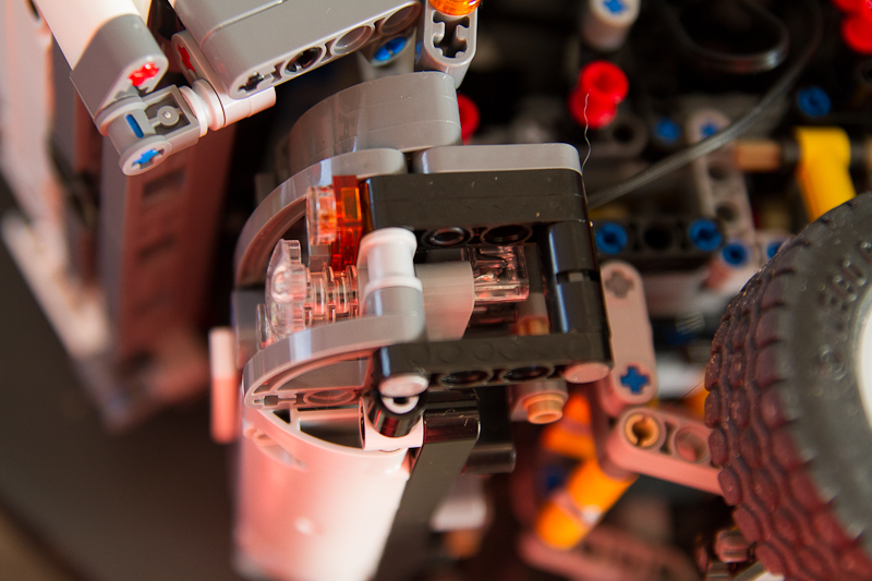 Concernant la motorisation, tout se passe sous le chassis, avec un moteur L. Je suis venu les axes qui venaient relier le moteur factice aux essieux arrière, et la place je suis venu greffer mon monteur L. J'ai remplace l'axe de 4 with stop par un axe de 3 en gardant la bevel 24T. J'ai du installer aussi une barre pour empêcher le moteur de reculer.