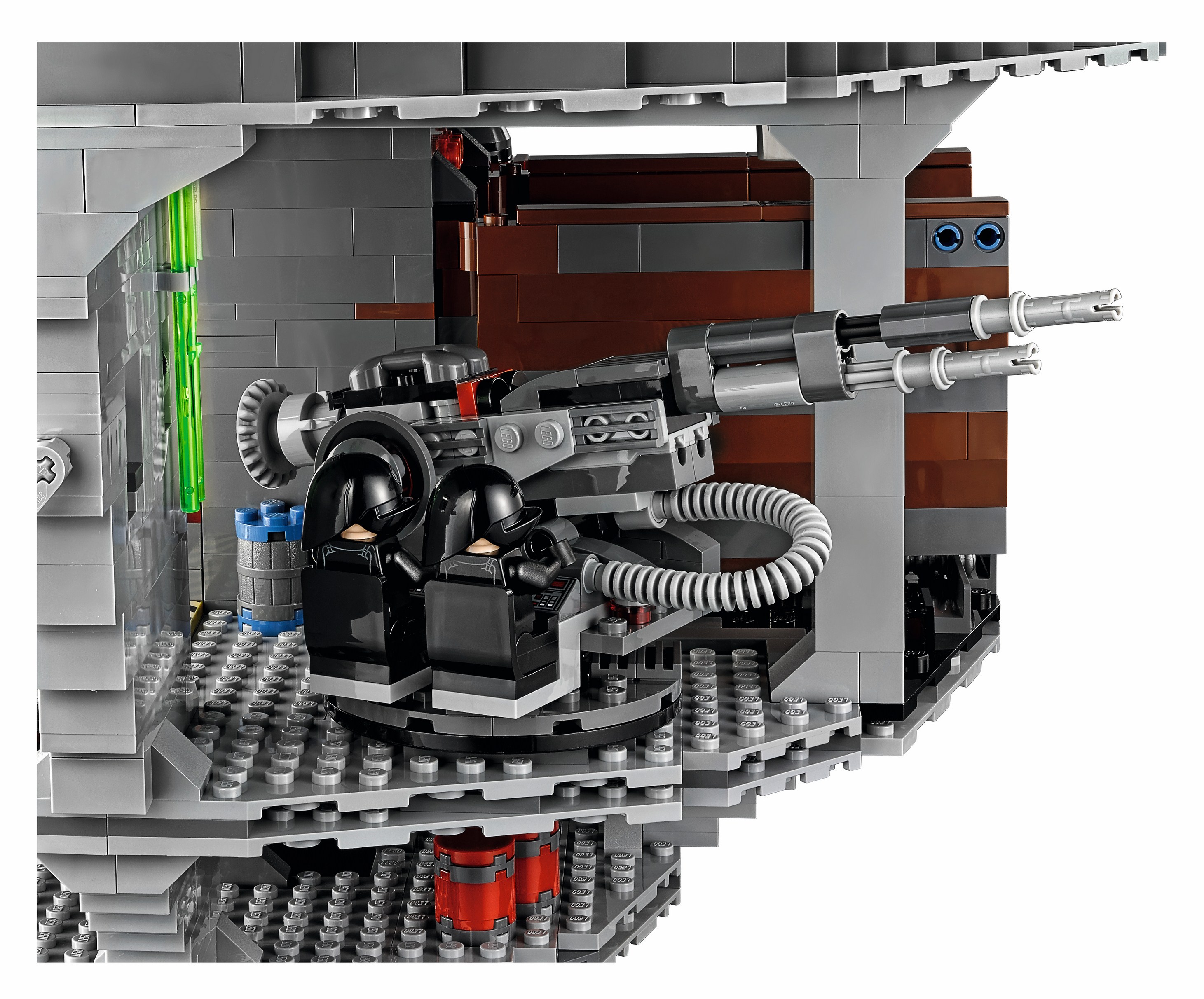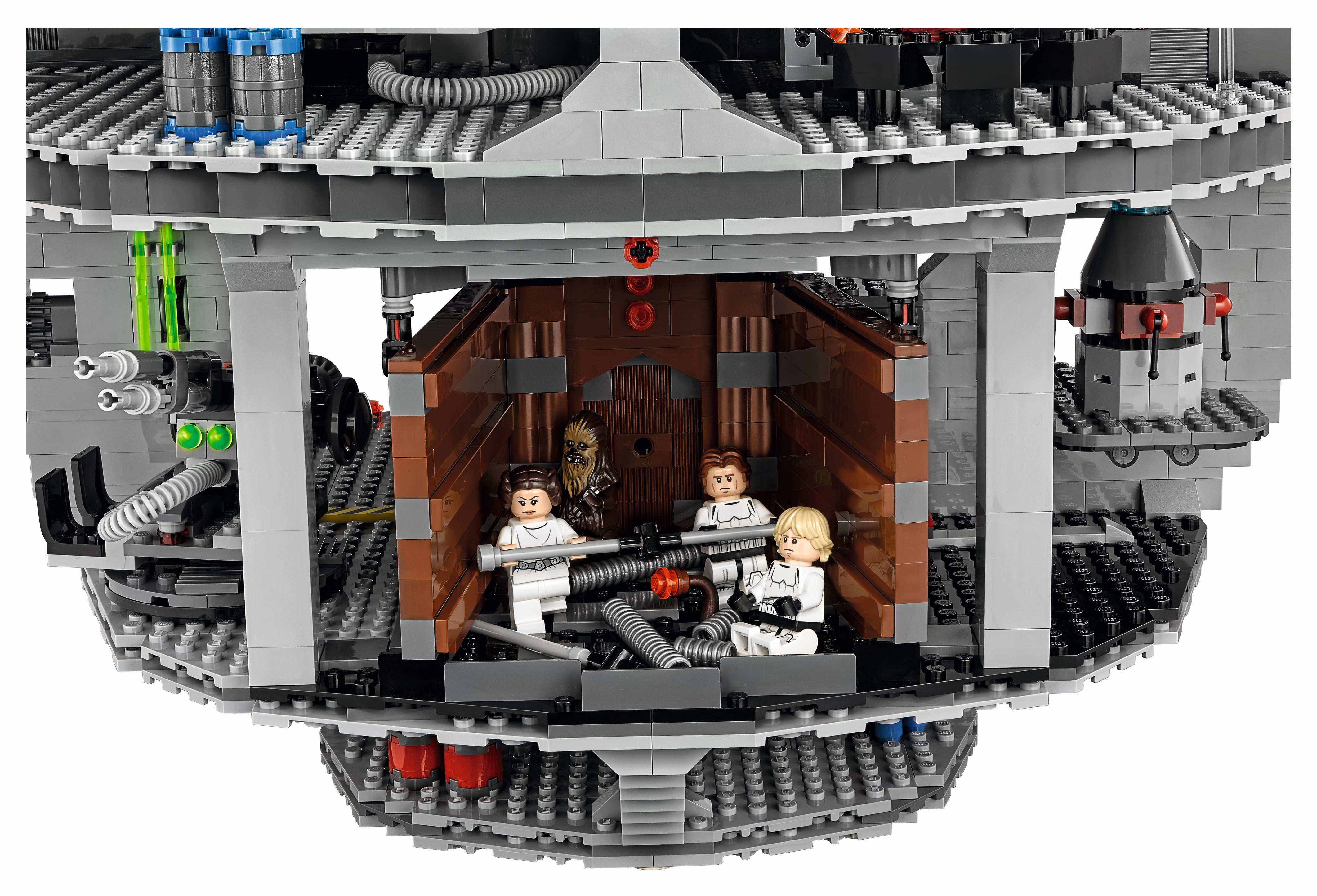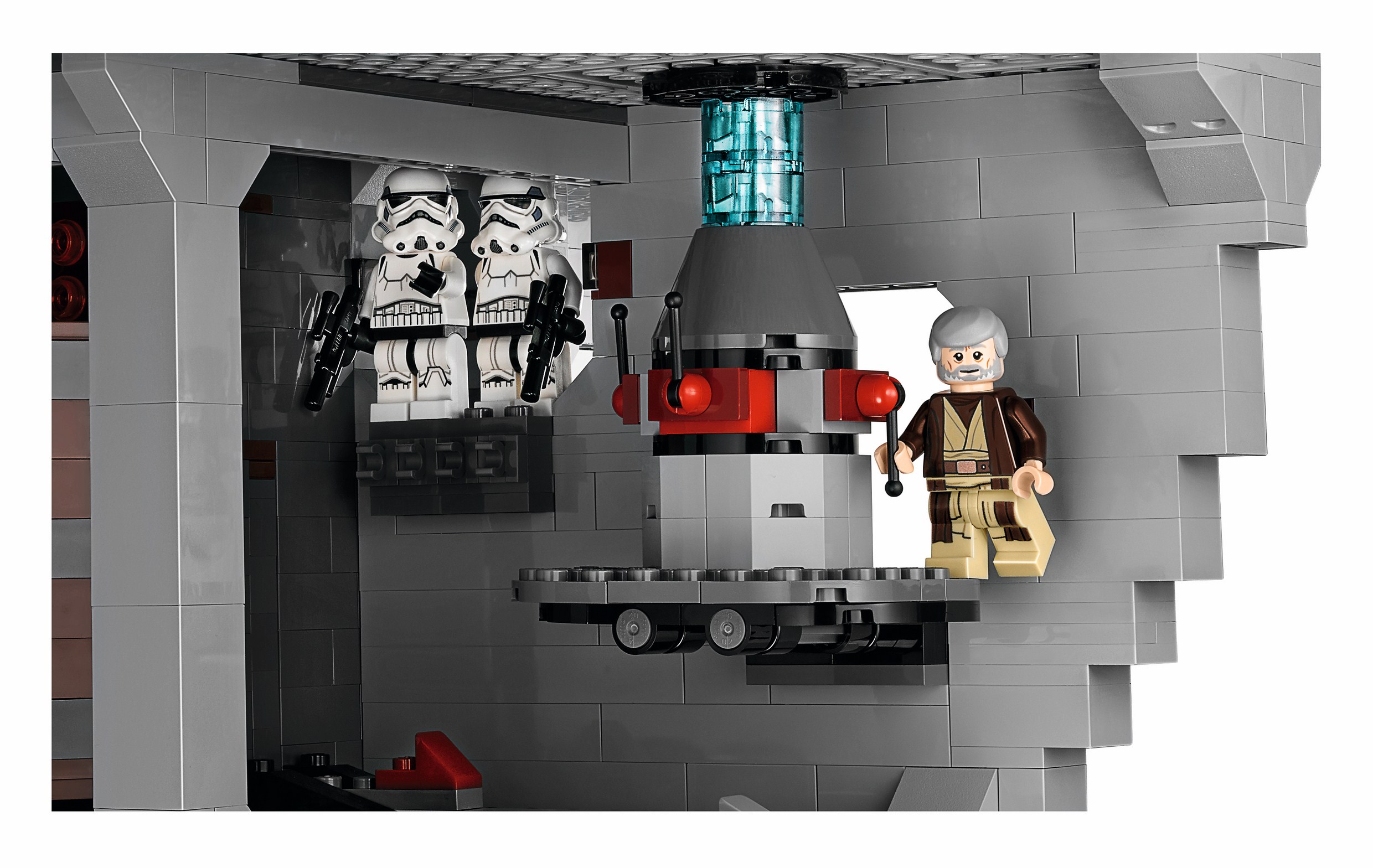 • Features a superlaser control room, Imperial conference chamber, hangar bay with moving launch rack and detachable TIE Advanced with space for Lord Vader inside, Emperor Palpatine’s throne room, Droid maintenance room, detention block, trash compactor, tractor beam, cargo area, turbo laser with spring-loaded shooters and seats for the 2 Death Star gunners, and 2 movable turbo laser towers.